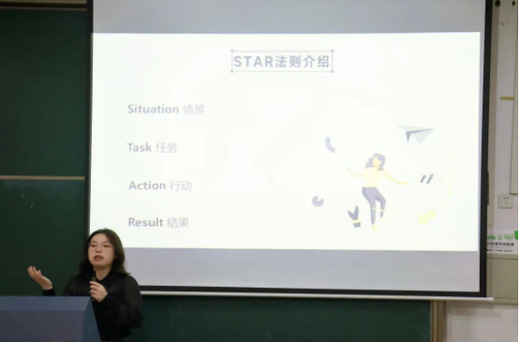 何雨沁围绕“简历内容”、“STAR法则”、“样例分析”和“面试准备”四个方面,分享了简历制作与面试环节的干货。首先,她指出简历中应包含个人基本信息、教育背景、实习经历、参加活动、荣誉及奖项、技能、证书、爱好和自我评价等内容,并结合自身工作经验,详细阐述简历中各类内容撰写的技巧。其次,她引导同学们可以通过STAR法则,即情景(Situation)、任务(Task)、行动(Action)和结果(Result)来准备面试。何雨沁以个人简历为例,分享了“更新简历”、“建立简历素材库”、“了解工作岗位”、“匹配度”等四个简历撰写注意点。最后,她以“宝洁八大问”和“SMART法则”介绍了面试技巧,鼓励学员们做足准备,大胆尝试。