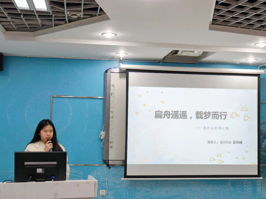 本次比赛要求选手们完成3分钟的PPT演讲展示。在展示环节,大家围绕主题、各抒己见,金融232班张涛以“规划精彩人生 打造职业未来”为题,分别从自我评估、职业认知、目标定位等方面阐述他对自己未来规划;会计235班祝巧璐围绕自己的职业定位:成为一名“农村财务会计”来规划自己的未来,她致力投身乡村振兴;会计236班葛锦曦以“扁舟遥遥 载梦而行”为主题,讲述了她心目中行而不辍、未来可期的人生。选手们在交流碰撞中明确未来发展方向,在交流互鉴中清晰职业成长规划。现场评委们根据大家的演讲内容、语言表达、形象风度、综合印象进行综合评定,最终共有12位选手晋级决赛。