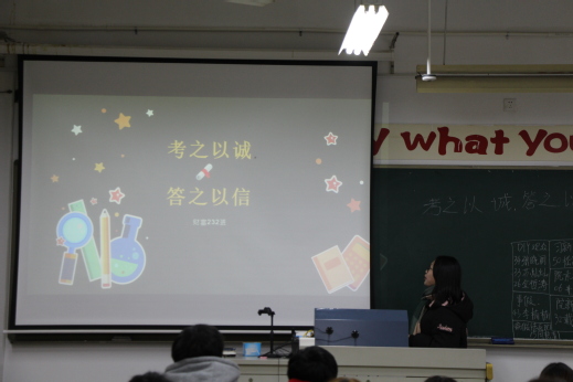 活动中,各班通过讲述PPT、观看诚信考试微视频、问答互动和分享心得等形式强调了“诚信考试”的重要性。大家还认真学习了诚信考试倡议书,同学们纷纷表示,在期末考试中将会端正态度、严于律己、认真复习、积极备考、严守考纪、诚信应考。除了诚信应考,什么还是打开期末备考的“正确打开方式”呢?有的班结合具体实例、图书馆所见、学长学姐所言,提出了机会是留给有准备的人的观点,大家应在考试前做好充足的准备,制定合理计划、确定复习重点、严格执行任务等。