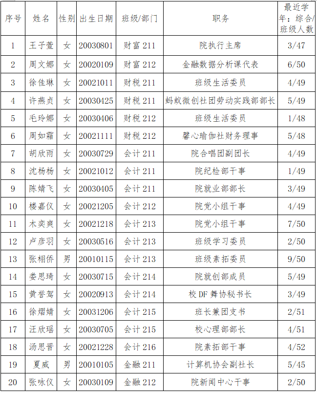 根据《中国共产党发展党员工作细则》(中办发〔2014〕33号)、《浙江经贸学院发展党员工作办法》的有关规定,财务会计学院学生党支部于2023年12月1日召开支部党员大会讨论通过接收王子萱等20位同志为中共预备党员,经财务会计学院党总支审议,决定将拟接收王子萱等20位同志为中共预备党员的情况予以公示,接受广大党员、群众监督。