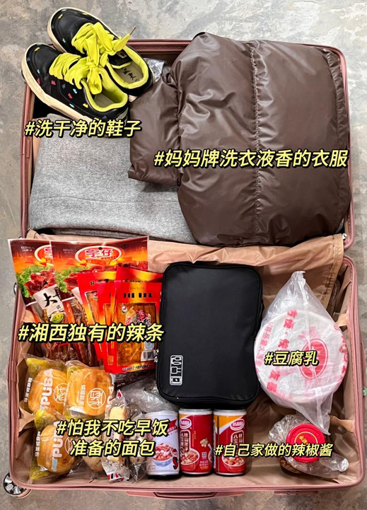 “给你装了几包老家的辣条,记得分给同学啊”