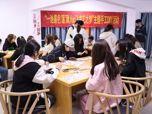 墨色深浅莲花绽,文化传承笔端传。为提升公寓育人效能,为同学们提供展示艺术才华的舞台,培养审美能力和创造能力,4月17日,学院组织学生在“一站式”学生社区成蹊苑35幢党员之家举办了“一池墨色’莲‘漪,fun飞书艺之梦”主题手工DIY活动。