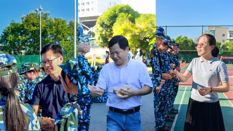 中秋当天,学院院长李国辉、党总支书记俞校明、党总支副书记隋伟燕深入军训场地,走访看望了2024级军训教官和参训学生,并认真观看了大家的训练。学院领导们首先向教官们表达了诚挚感谢,他们表示,教官的严格要求和无私奉献为同学们树立了良好榜样,这是军训工作取得成功的重要保障。随后,学院领导老师详细询问了同学们的军训和日常生活,高度肯定了同学们在训练中展现出的坚韧不拔、积极向上的精神风貌,并鼓励大家在接下去的训练中要不畏困难、勇于挑战,充分展现出学院学子的蓬勃朝气和青春风采,把从军训中磨砺出的好作风融入今后的生活和学习中。最后,领导们还为教官和同学们送上了学院专门定制的、象征团圆的月饼,并送上了节日的美好祝福。