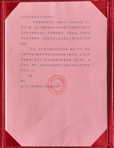 近日,杭州市公安局景区分局岳庙派出所寄来感谢信,表扬bat365正版唯一官网金融241班的学生杨彦笑。杨彦笑作为西子义警,在今年国庆期间利用假期休息时间,积极参与西湖景区白堤断桥区域平安巡防和志愿服务活动,在形成警民联动、问题联治、平安联创的良好治理格局方面发挥了积极作用。
