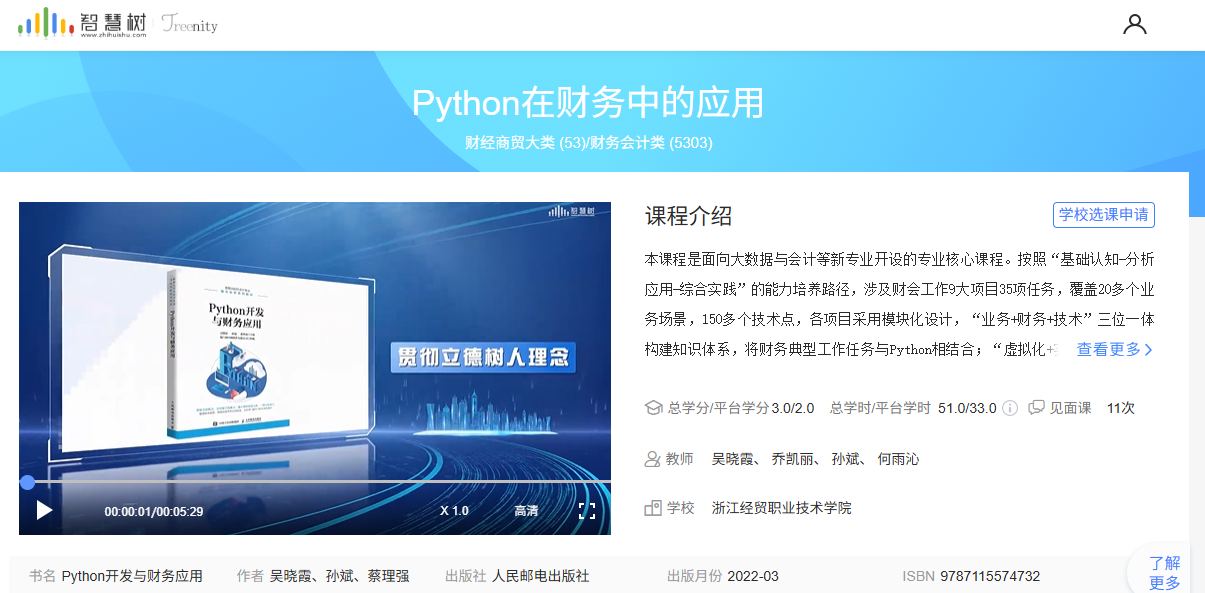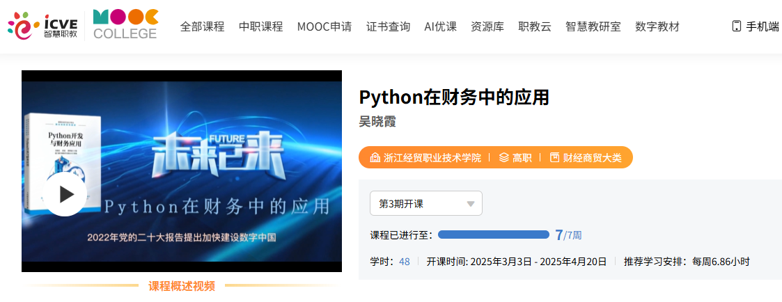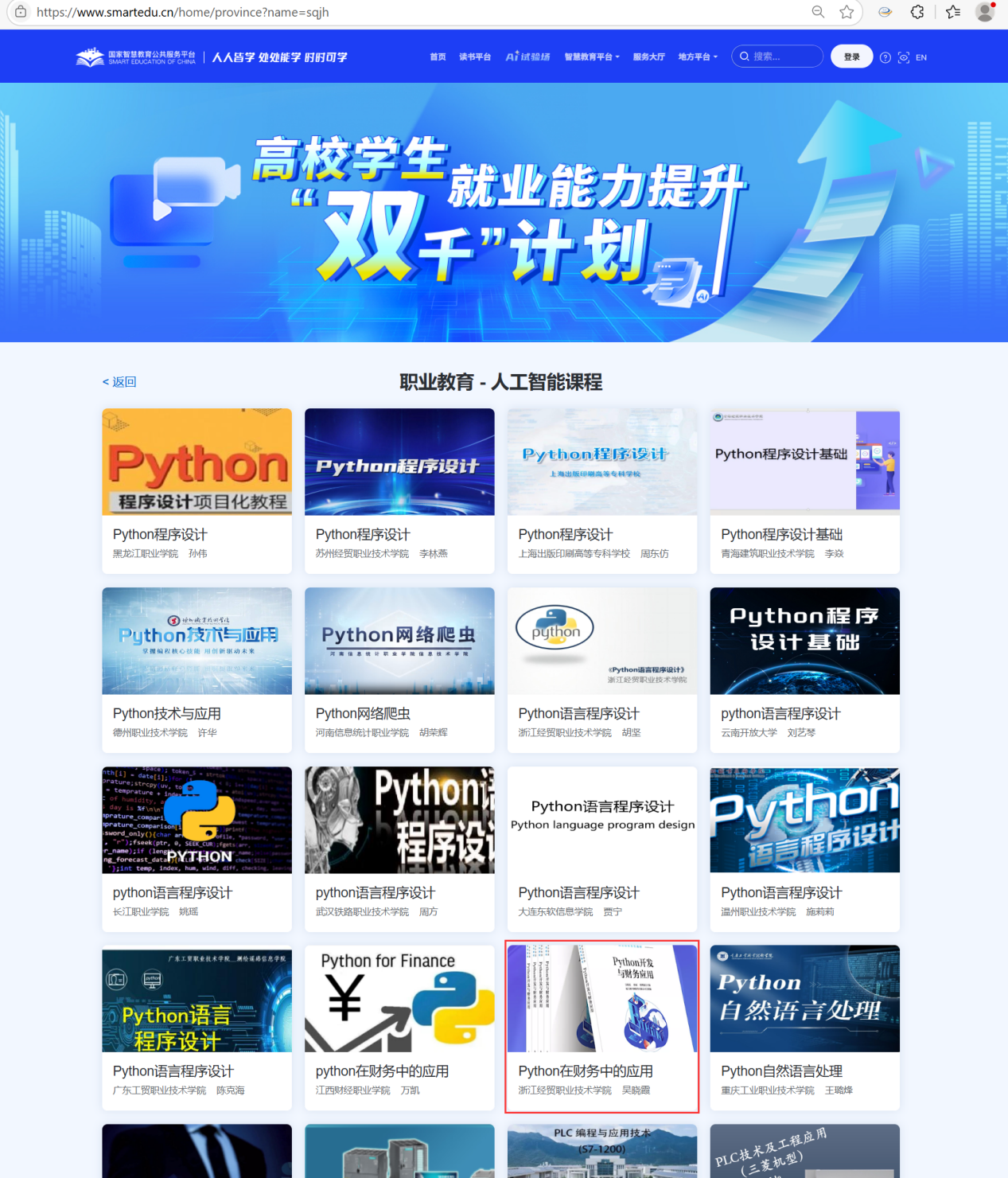 近日,教育部国家智慧教育平台2.0智能版正式上线,学院吴晓霞老师负责的《Python在财务中的应用》课程,成功入选“高校学生就业能力提升‘双千’计划”职业教育人工智能课程。